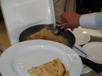 Normalmente, montamos duas mesas redondas com oito lugares cada. Na primeira mesa, é servida a ementa do dia da cozinha e, na segunda mesa, as iguarias são confeccionadas e servidas às pessoas que se inscrevem antecipadamente.